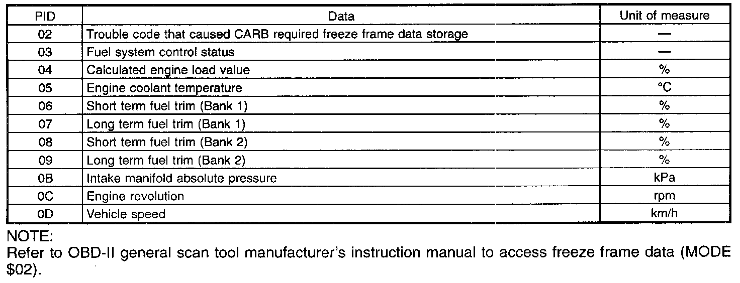 Refers to data denoting the operating condition when trouble is sensed by the on-board diagnosis system. A list of the support data and PID (Parameter Identification) codes are shown in the above table.