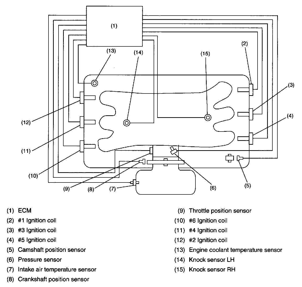 The ECM monitors the operating condition of the engine using the signals from the sensors and switches shown above and determines the ignition timing most appropriate for each engine operating condition. Then it sends a signal to the ignitor, commanding generation of a spark at that timing.