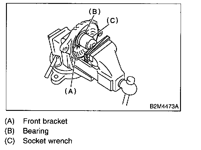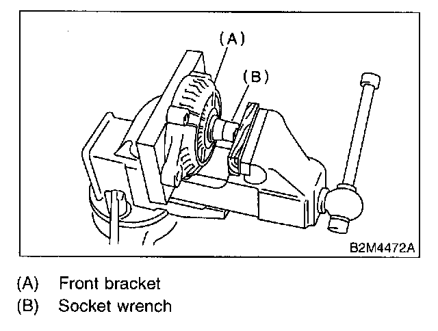 2. Closely install a fit tool on the bearing inner race. Press the bearing down out of front bracket with a hand press or vise. A socket wrench can serve as the tool.