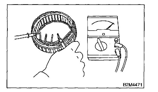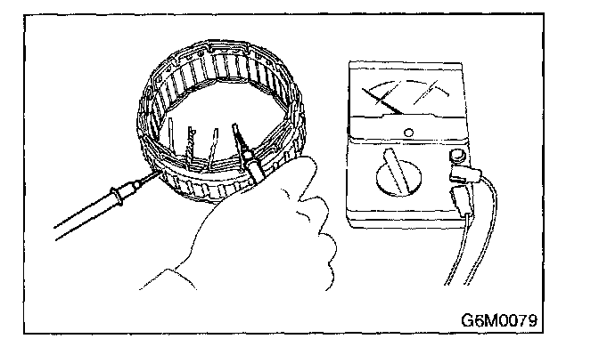 Inspect stator coil resistance is 1 Ohm or less between stator core and each end of the lead wire. If resistance is 1 Ohm or less, the stator coil is grounded, and so replace stator assembly.