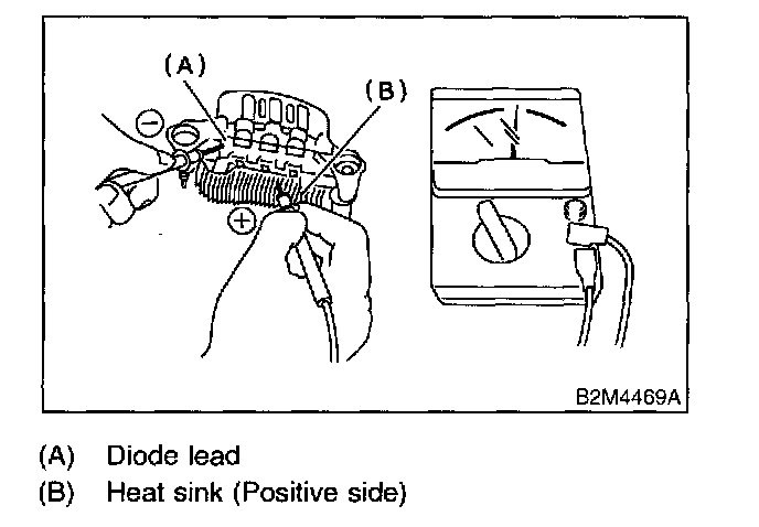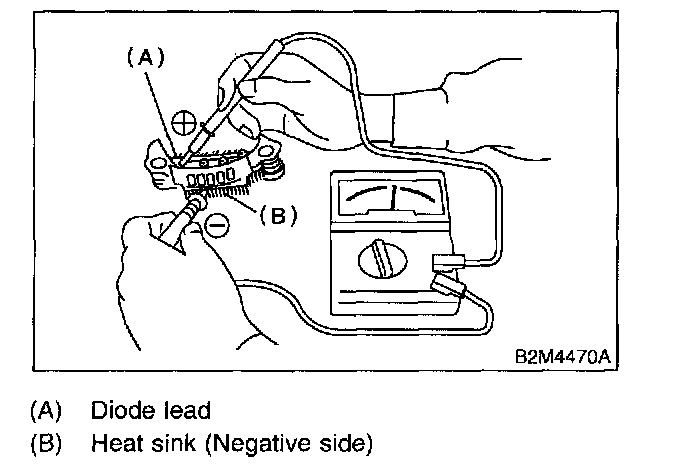 Check for resistance of 1 Ohm or less between the negative side heat sink and diode lead. The negative diode is in good condition if resistance is 1 Ohm or less only in the direction from the heat sink to the diode lead.