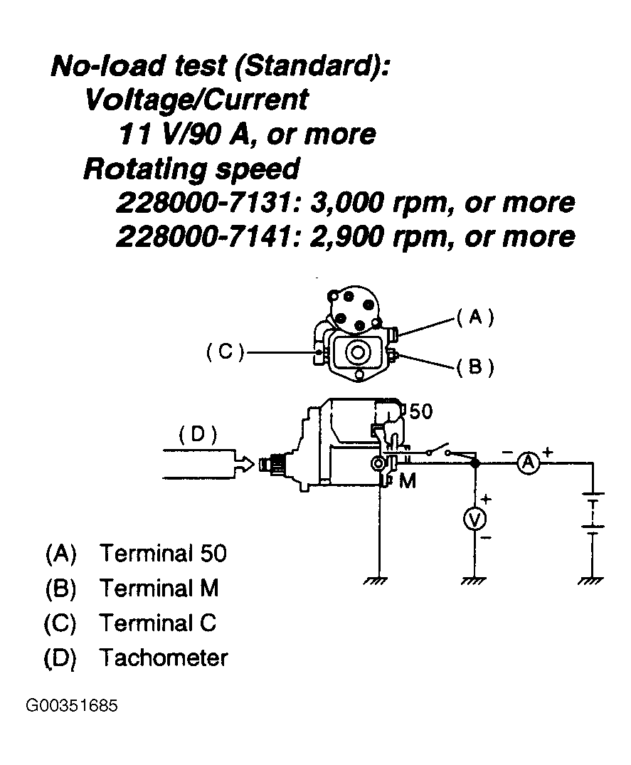 Under no-load state, measure starter's rotating speed and current, using the specified battery. Measured values must meet the standards. See Fig 1.