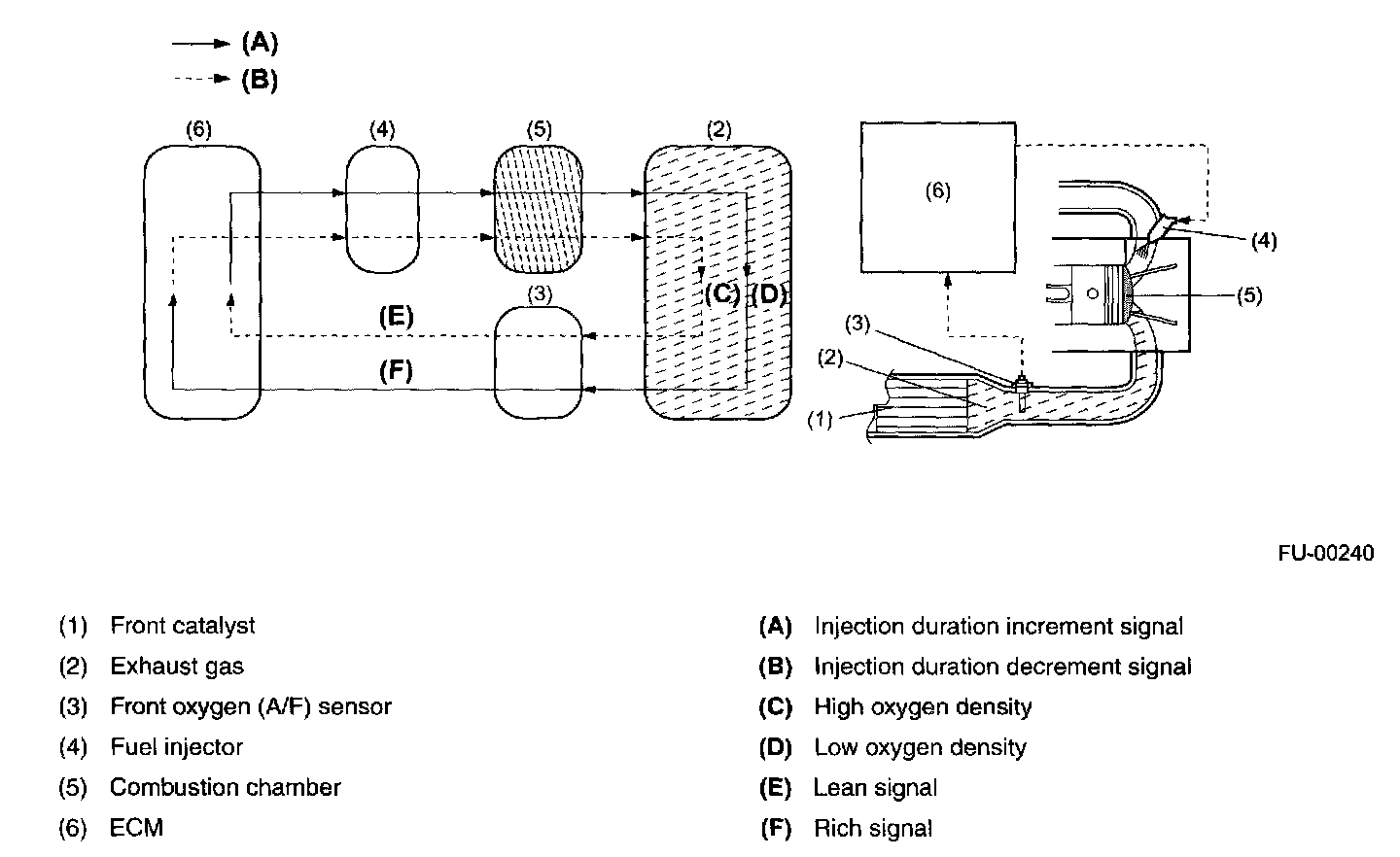 - In the air-fuel ratio feedback control, the ECM calculates the necessary amount of correction based on data from the oxygen sensor and adds the result to the basic duration (which is stored in the ECM's memory for each condition defined by the engine speed and various loads.)