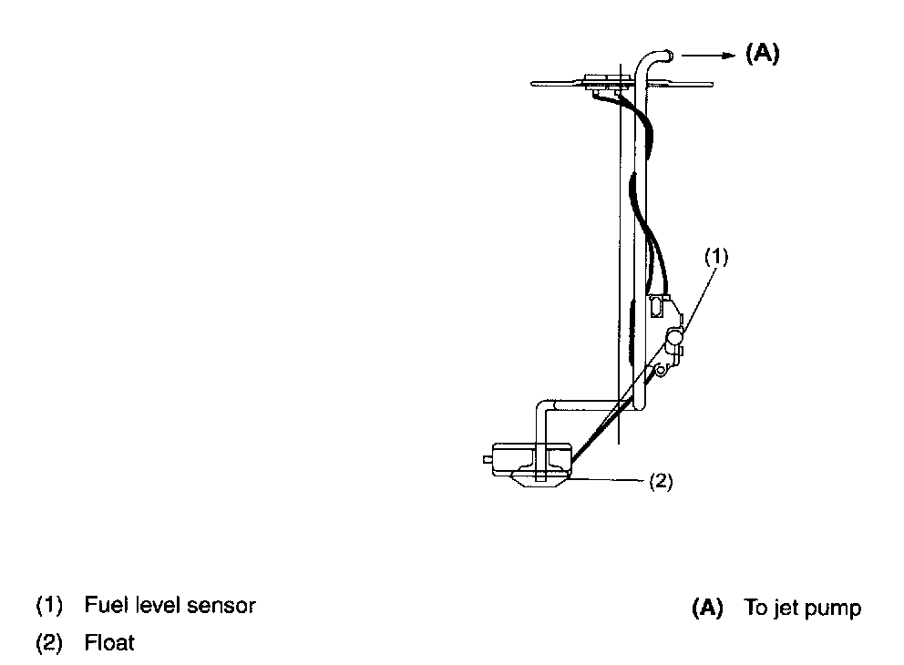 SUB-COMPARTMENT FUEL LEVEL SENSORThis sensor detects the level of the fuel in the sub-compartment (the compartment in which the fuel pump is not located) and acts as part of the fuel transfer line when the jet pump is in operation to maintain the fuel in both compartments at the same level.