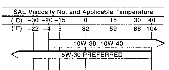NOTE: If vehicle is used in desert areas with very high temperatures or for other heavy duty applications, the following viscosity oils may be used: ILSAC classification: GF-3 or API classification: SLSAE Viscosity No.: 30, 40, 10W-50, 20W-40, 20W-50.