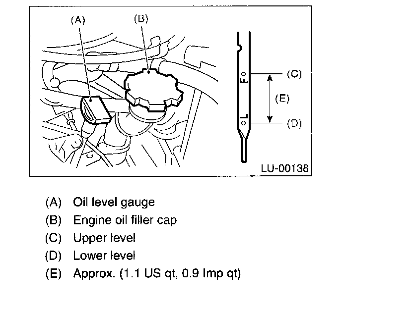 CAUTION: When replenishing oil, it does not matter if the oil to be added is a different brand from that in the engine; however, use oil having the ILSAC or API classification and SAE viscosity No. designated by SUBARU.