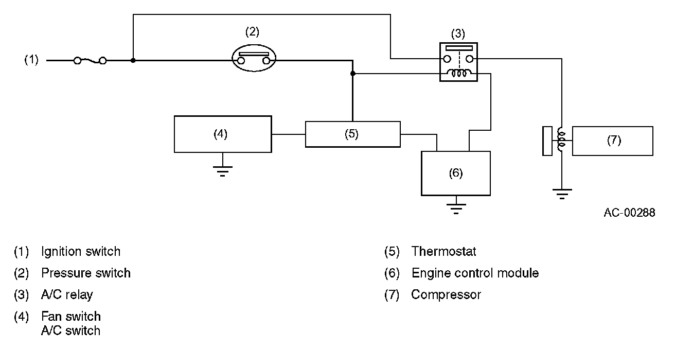 When the A/C switch and fan switch are turned ON, a signal is sent to the engine control module. The engine control module then judges whether the engine is in operation. If the engine is operating, the engine control module activates the A/C relay. The maximum clutch "ON" delay times is 0.8 seconds after the A/C relay is activated.