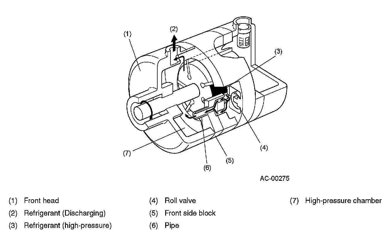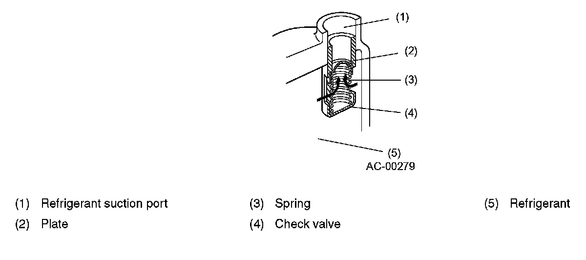 A check valve consisting of a spherical plate and spring is provided at the suction port of the rear head. Immediately after the compressor has stopped, there is large difference between the high and low-pressures. This would cause reverse rotation of the compressor and consequent reverse flow of refrigerant to the evaporator if no check valve is provided. Immediately after the compressor has stopped, the high-pressure refrigerant forces the check valve plate upward and closes the suction port to prevent flow of refrigerant from the high-pressure side to the low-pressure side.