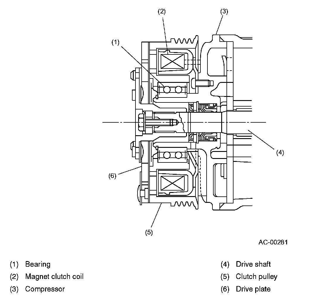 The magnet clutch serve to transmit engine power to the compressor module. It is built into the compressor shaft. When current flow through the magnet clutch coil, the drive plate is attracted so that the pulley and compressor shaft rotate as a module. When the compressor is not in use, the pulley alone rotates freely.