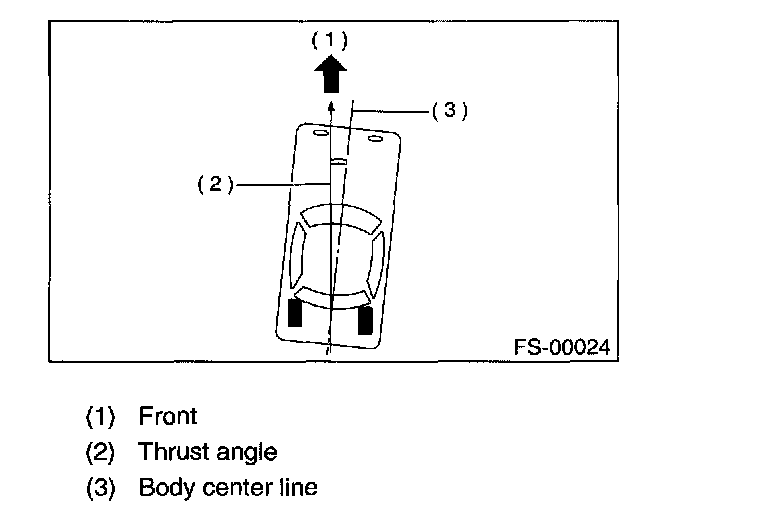 NOTE: Thrust angle refers to a mean value of left and right rear wheel toe angles in relation to vehicle body center line. Vehicle is driven straight in the thrust angle direction while swinging in the oblique direction depending on the degree of the mean thrust angle.