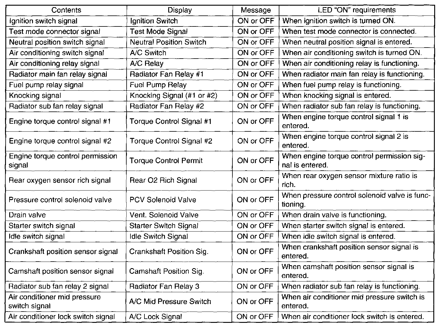 When the rear defogger switch is turned ON, ON is displayed. When turned OFF, OFF is displayed. This signal is used for idle control or other controls.