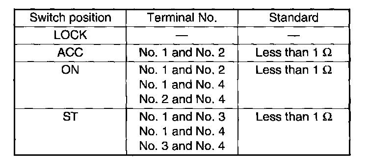 4. Turn the ignition key plate to each position and check the continuity between the terminals of the ignition connector.