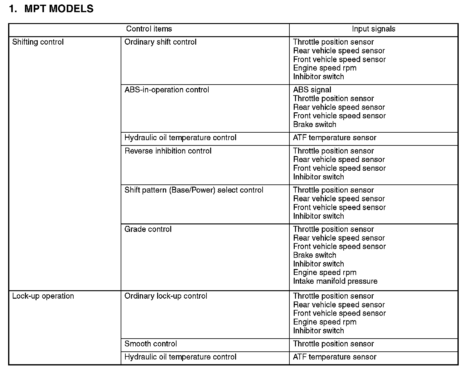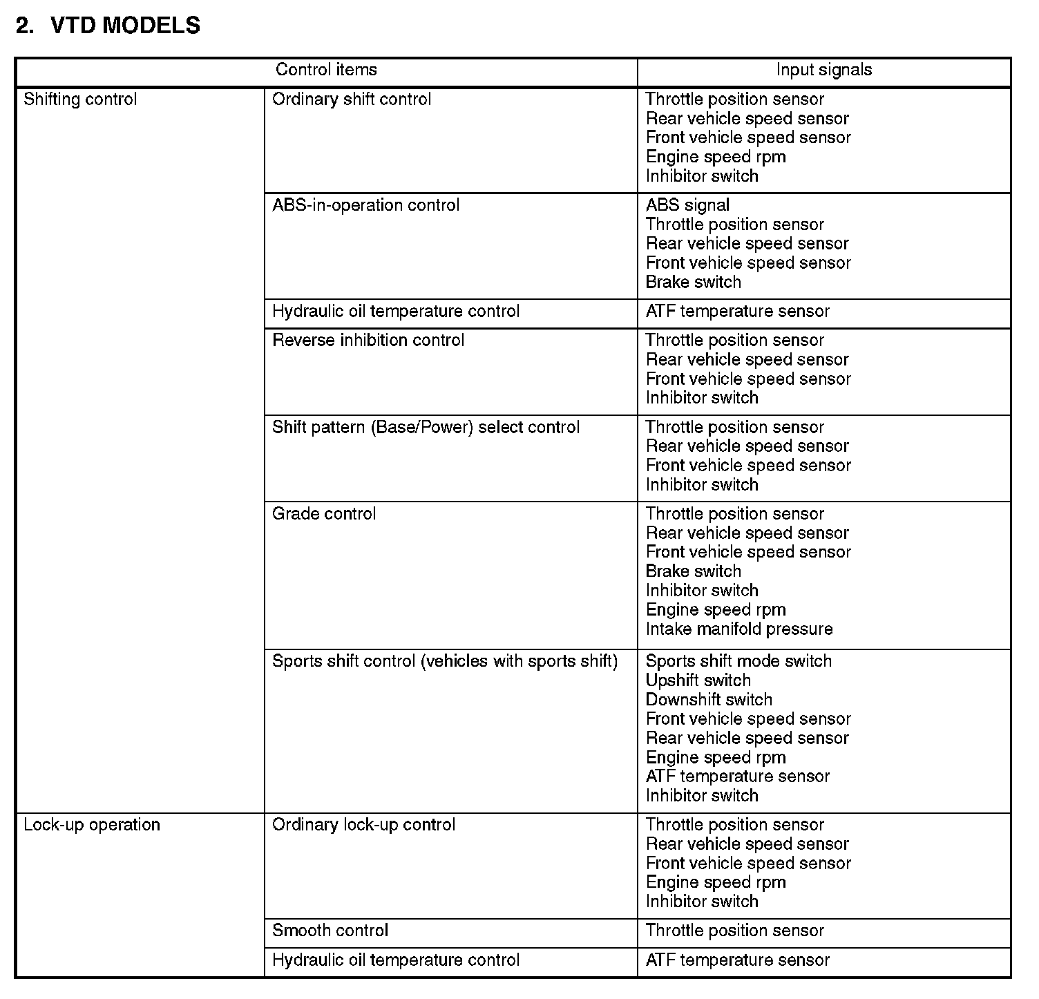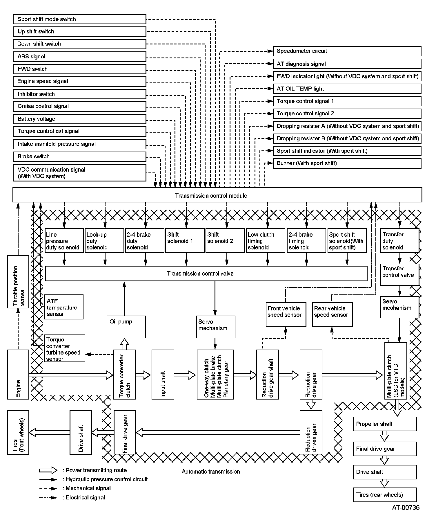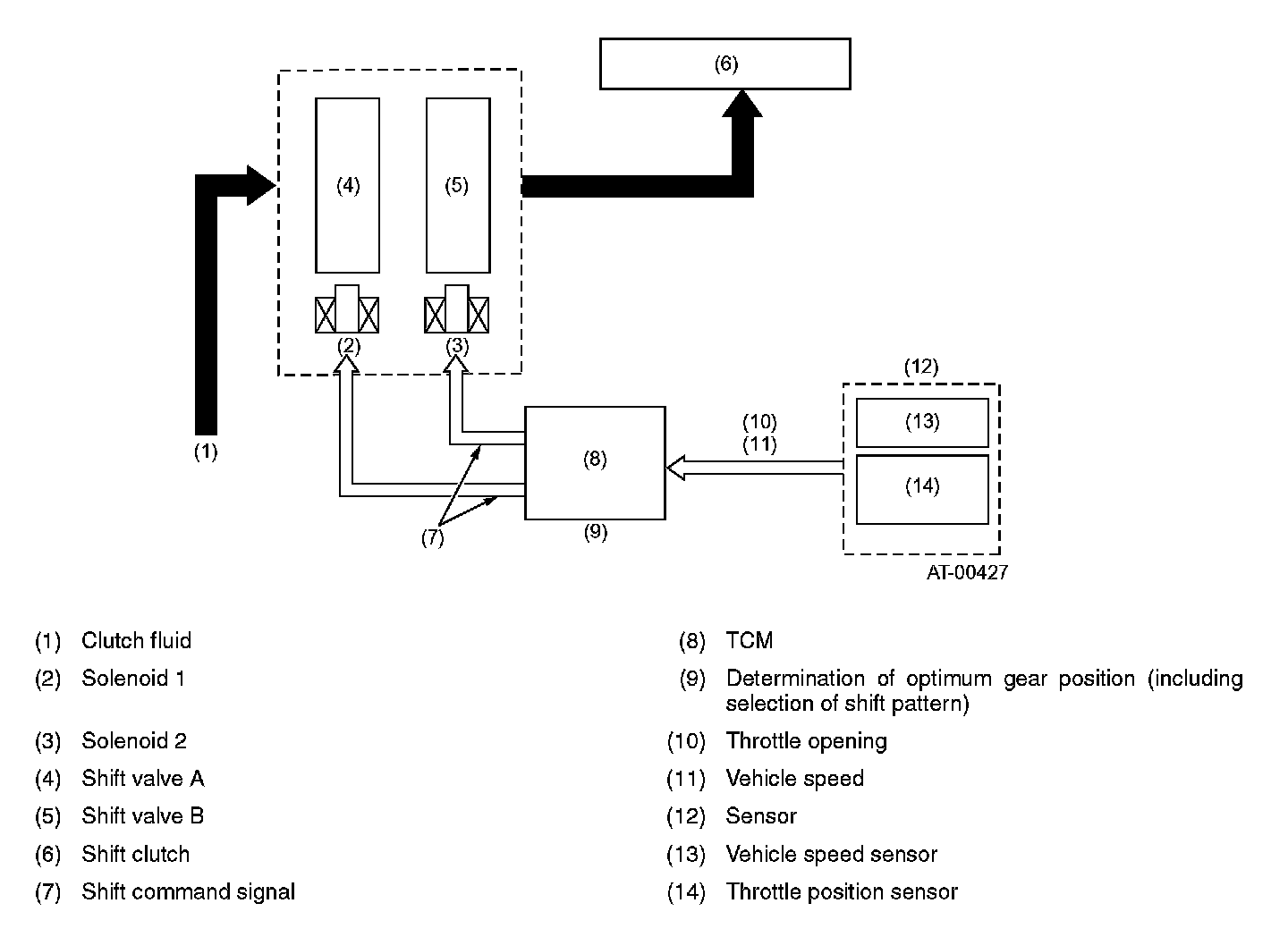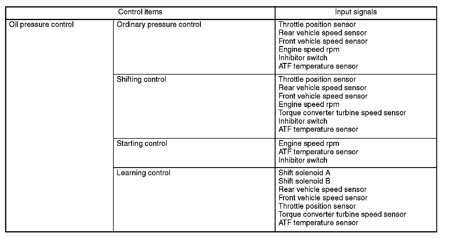 The TCM performs these controls based mainly on the throttle opening, engine speed and vehicle speed.
