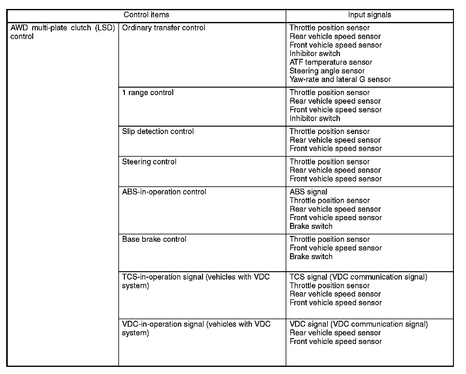 The TCM is constantly monitoring the driving conditions of the vehicle using the eleven input signals. Based on the conditions it has determined, the TCM adjusts the duty ratio of current to the transfer duty solenoid thus changing the engagement of the multi-plate clutch.The input signals are used also for automatic transmission control.