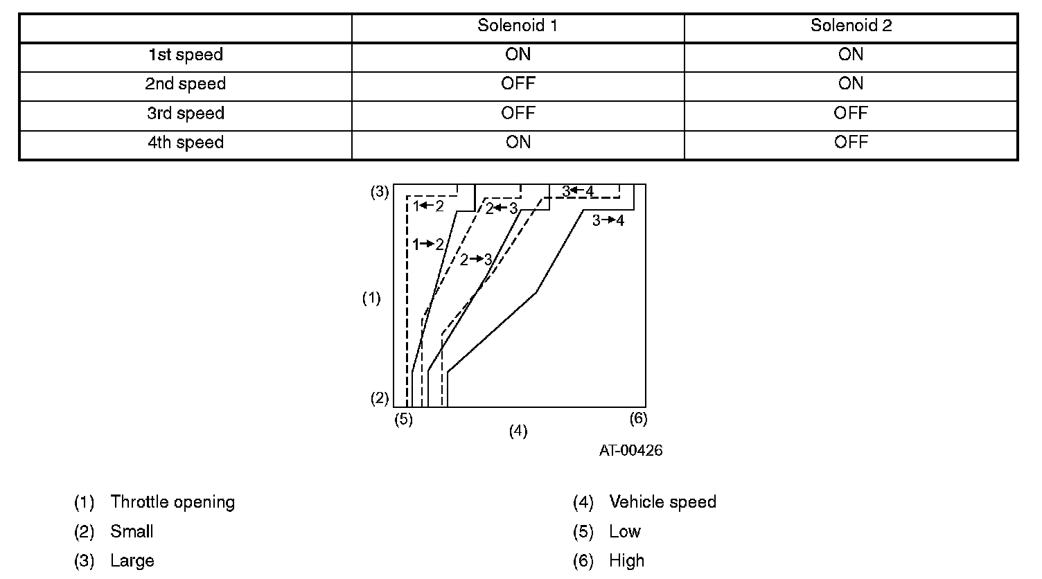 - A shift to each gear takes place according to ON-OFF operation of both the solenoids as indicated in the table above.