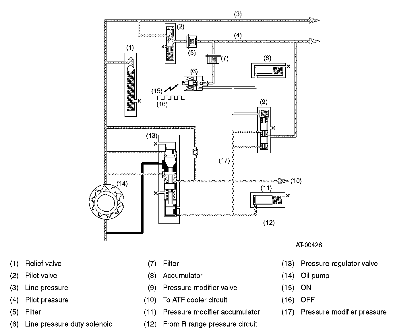 - The pressure from the line pressure duty solenoid (line pressure duty pressure) is converted by the pressure modifier valve into a modifier pressure, and the modifier pressure is applied to the pressure regulator valve.