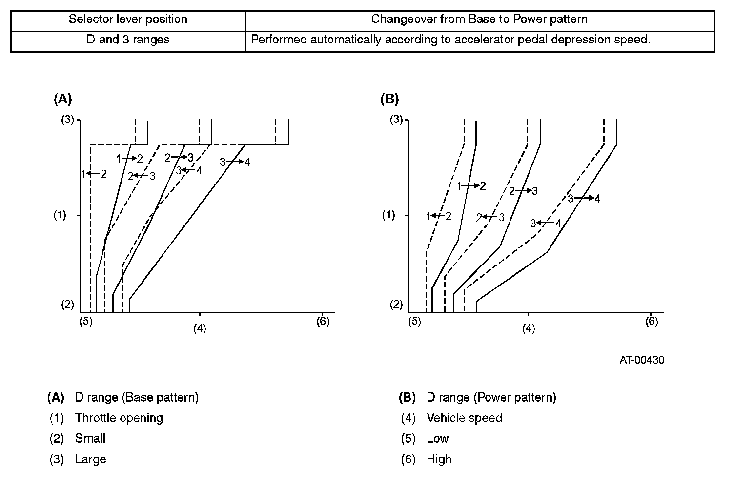 The TCM changes its gear shift control pattern automatically between the Base pattern suitable for ordinary economy driving and the Power pattern suitable for climbing uphill or rapid acceleration.