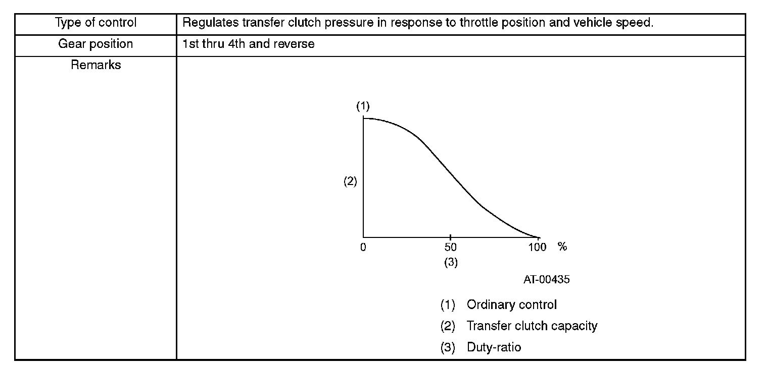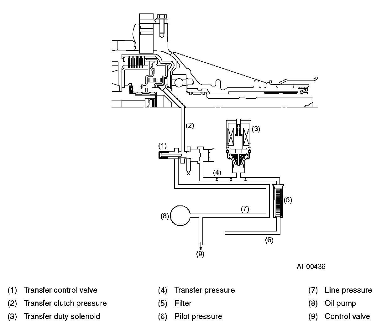 - The transfer duty solenoid is controlled by the TCM. The TCM changes the solenoid controlling duty ratio according to driving conditions.
