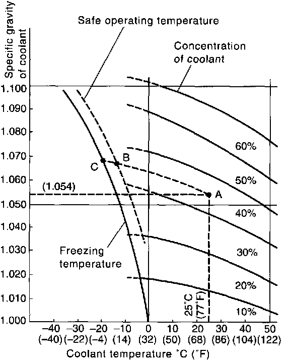 If the coolant temperature is 25°C (77°F) and its specific gravity is 1.054, the concentration is 35% (point A), the safe operating temperature is -14°C (7°F) (point B), and the freezing temperature is -20°C (-4°F) (point C).