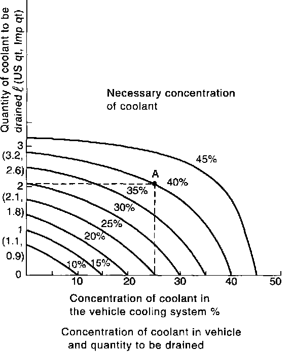 Assume that the coolant concentration must be increased from 25% to 40%. Find point A, where the 25% line of coolant concentration intersects with the 40% curve of the necessary coolant concentration, and read the scale on the vertical axis of the graph at height A. The quantity of coolant to be drained is 2.1 liters (2.2 US qt. 1.8 Imp qt). Drain 2.1 liters (2.2 US qt. 1.8 Imp qt) of coolant from the cooling system and add 2.1 liters (2.2 US qt. 1.8 Imp qt) of the undiluted solution of SUBARU coolant.