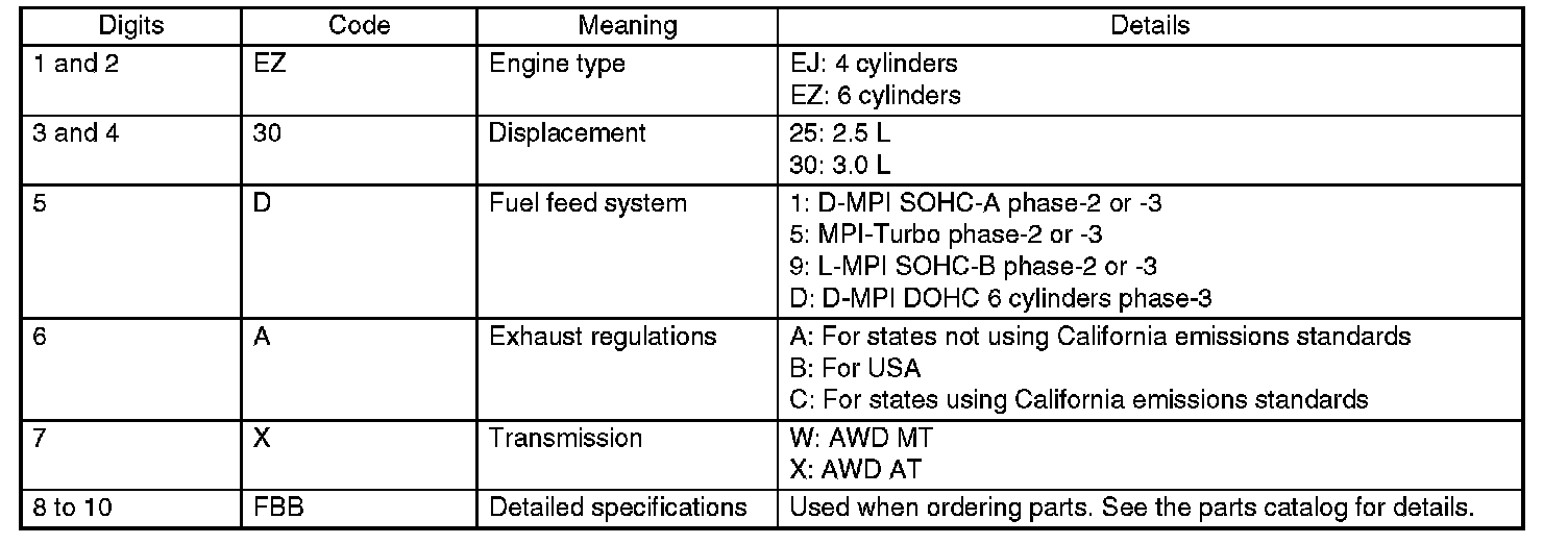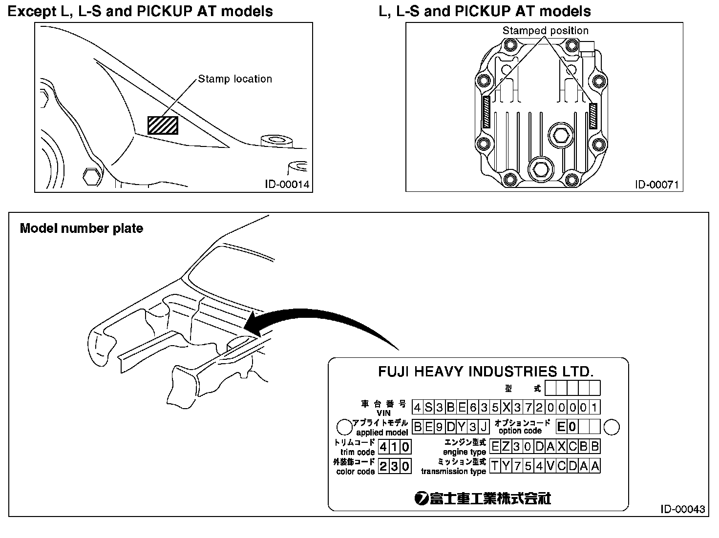 The model number plate indicates: the applied model, the option code, the trim code, the engine type, the transmission type, and the exterior color code. This information is helpful when placing orders for parts.