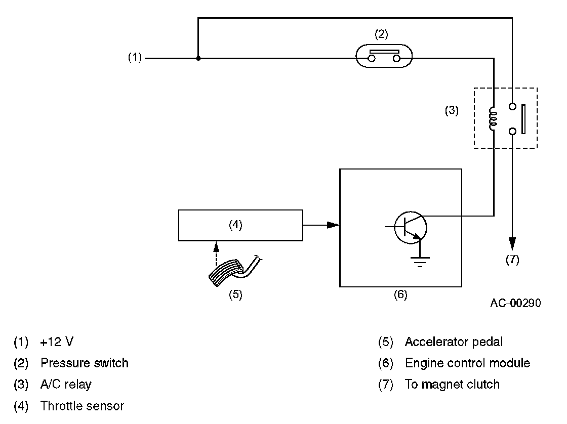The A/C switch turns the air conditioning system ON and OFF. The on-off signals from the switch are transmitted to the engine control module (ECM).