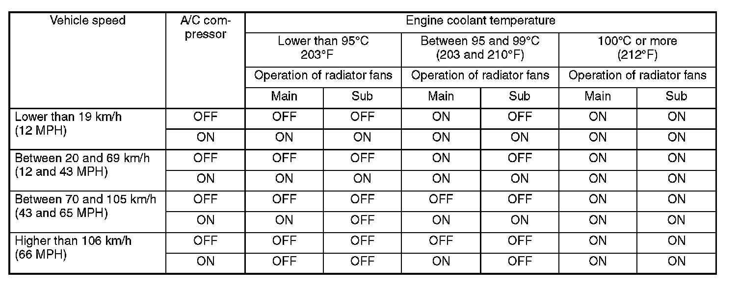 The main fan and sub fan are switched ON and OFF according to the operating modes as shown in the above table.