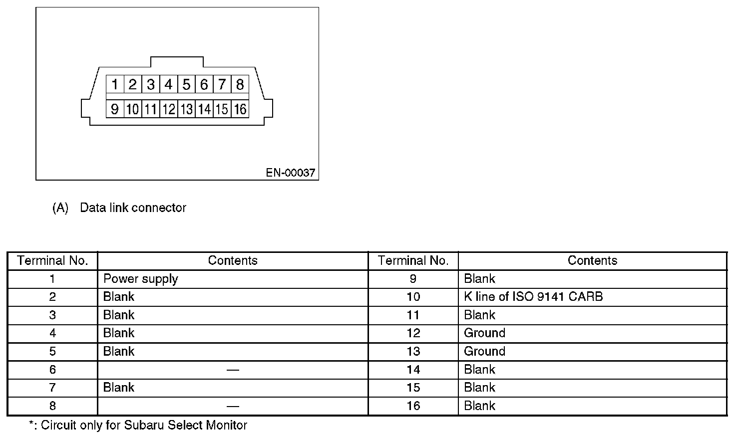 1. This connector is used both for OBD-II general scan tools and the Subaru Select Monitor.