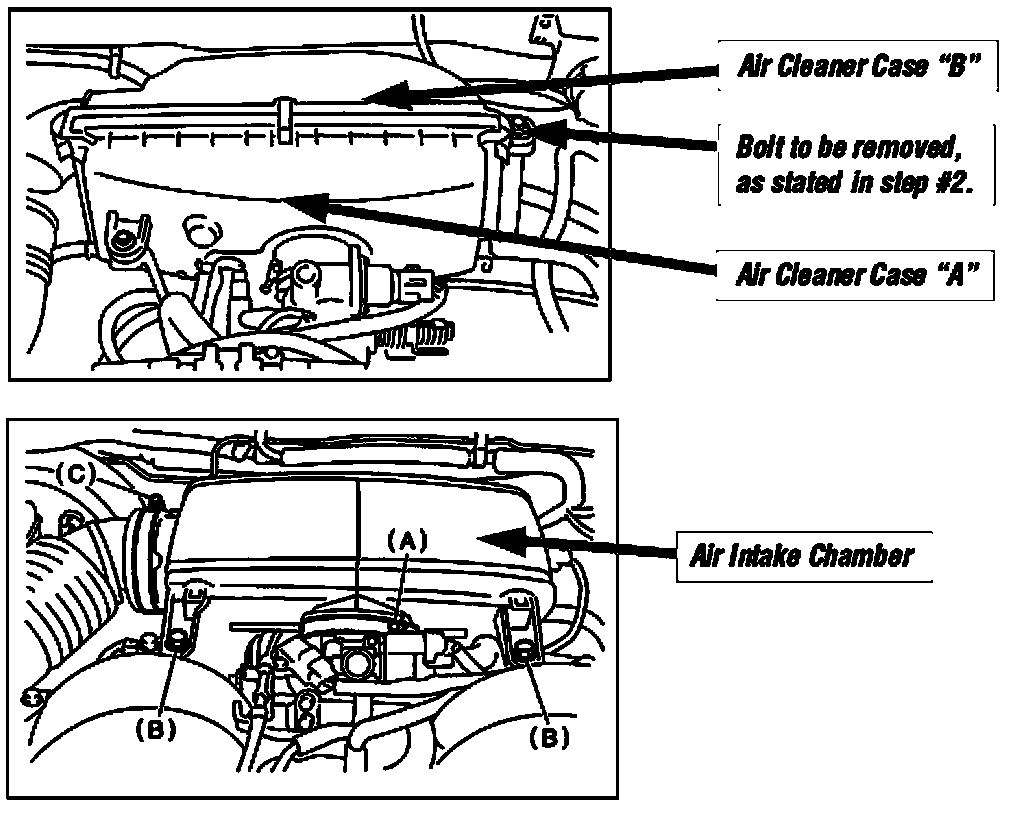 2) On 2.2L/2.5L engines only, remove the bolt that attaches air cleaner case 'B' to the bracket.