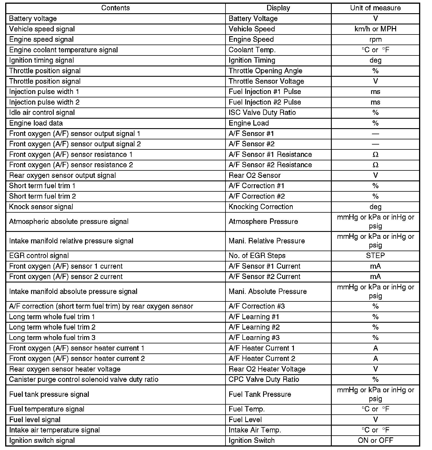 Using the signal from the front oxygen (A/F) sensor, the correction value of the fuel supply amount regulated by the ECM is indicated. When the A/F is lean and when displayed value becomes 0 % or more, ECM increases the fuel. When the A/F is rich and when displayed value becomes 0 % or less, ECM decreases the fuel.