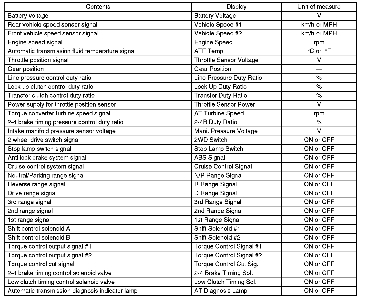 When the 2-4 brake timing solenoid is ON, ON is displayed. When OFF, OFF is displayed. The 2-4 brake timing solenoid is regulated by the TCM, controlling the release timing of the 2-4 brake.