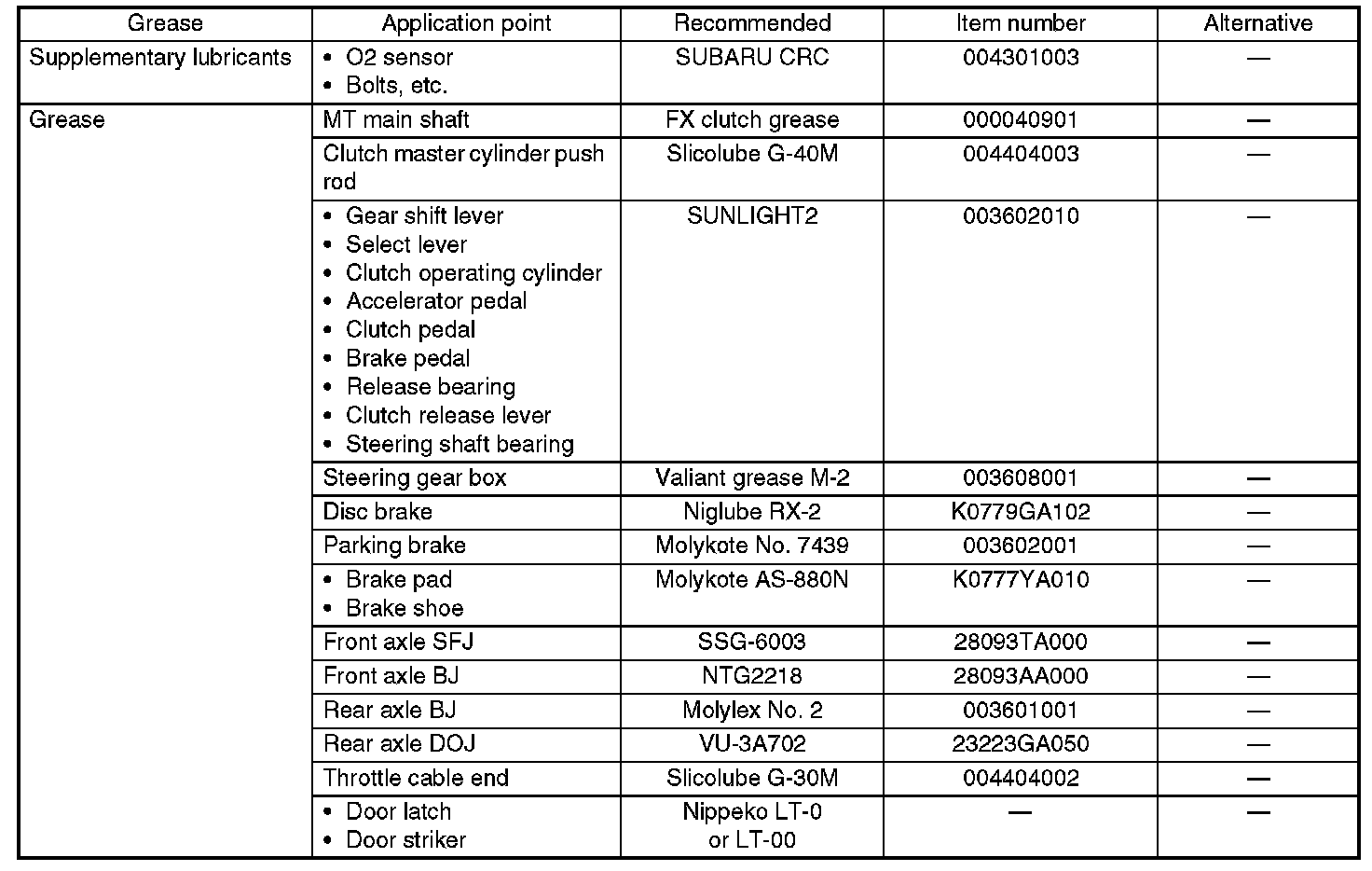 Use the grease and supplementary lubricants shown in the table.