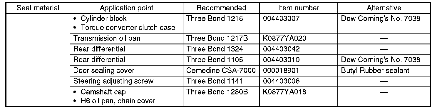 Use seal material shown in the table, or equivalent.