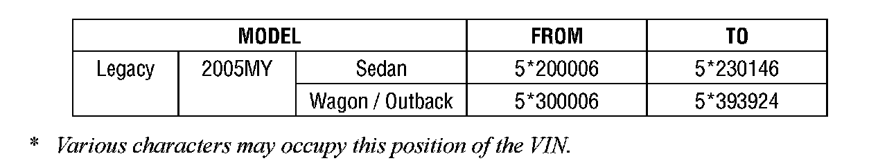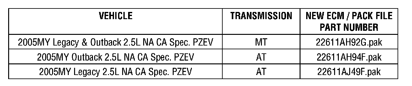 2005 MY Subaru Legacy and Outback with CAL PZEV Spec Emission System and motor vehicle registration in any state except California, Massachusetts, Maine, New York or Vermont.