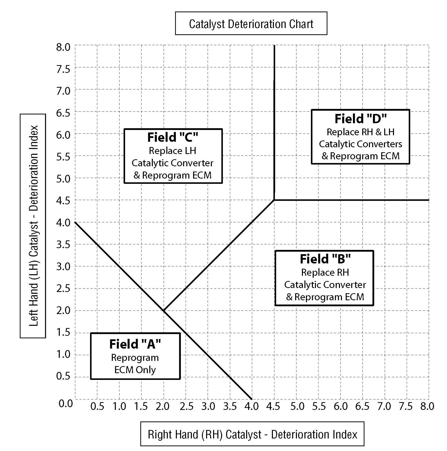 Plot the intersection of the RH and LH deterioration indexes in the appropriate position of the following Catalyst Deterioration Chart. Determine the correct repair procedure identified in the corresponding field found on the chart and proceed accordingly. In all cases, the ECM should be reprogrammed with the updated Pack file.