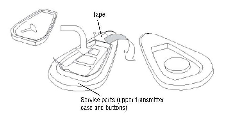 3) Peel off the tape of the service parts (upper transmitter case and buttons) and assemble them in reverse steps of disassembly.