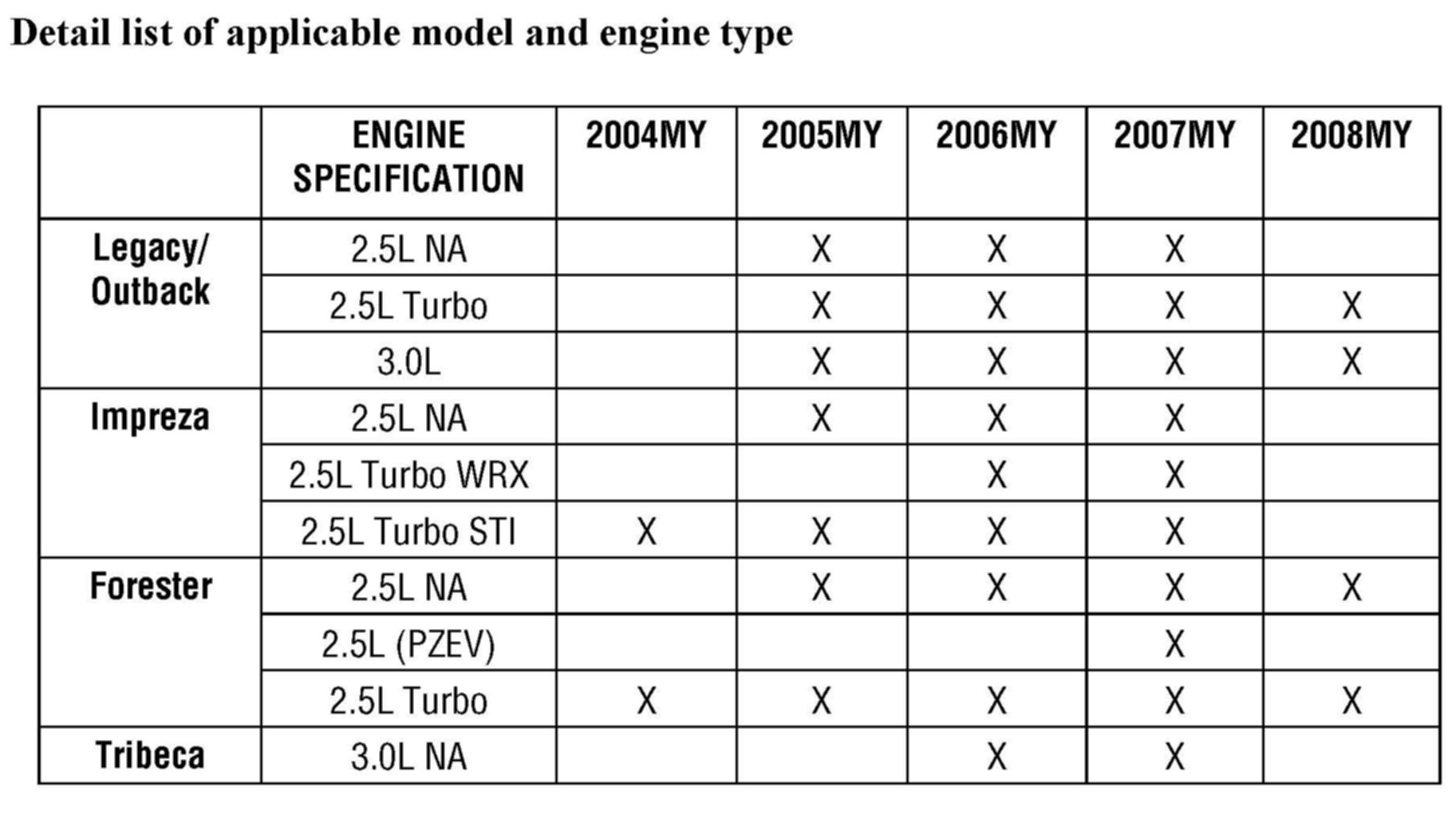 Detail list of applicable model and engine type.