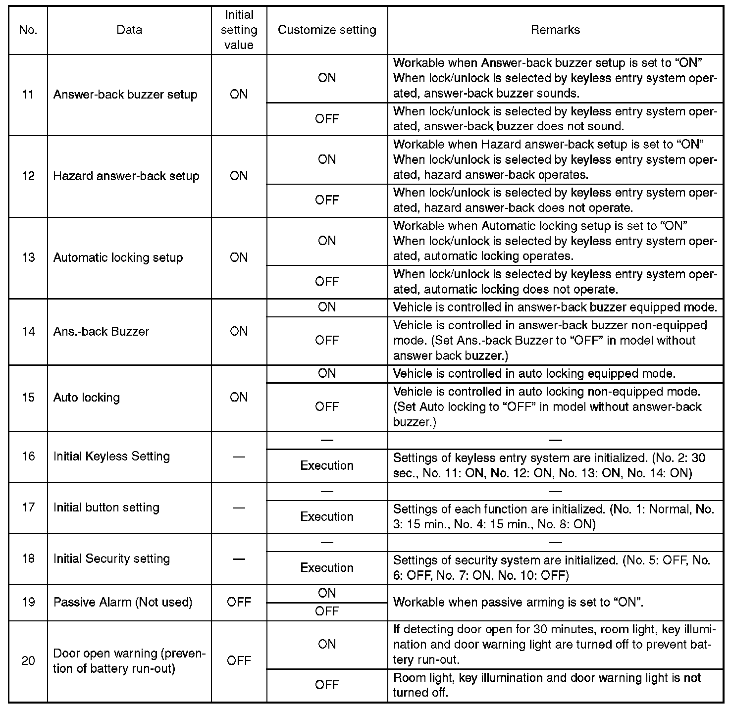 Each settings have been set. It can be recognized by key illumination coming on in concocting with room light and going off with ignition switch turned to ON.