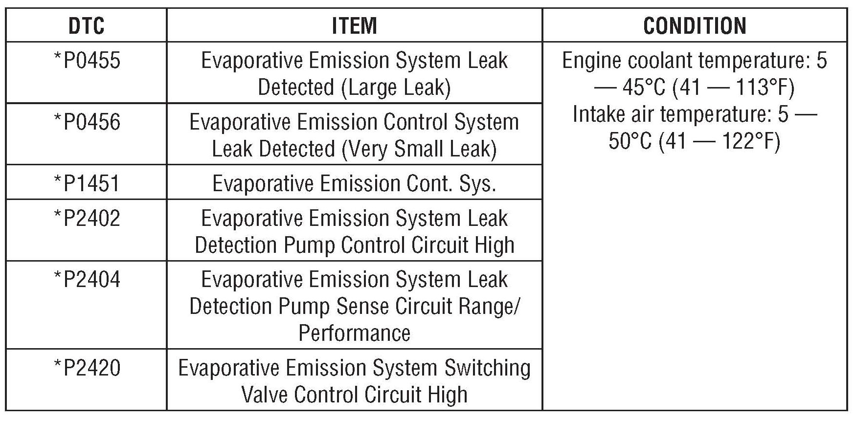 19) When the evaporative system leak test is completed correctly read the temporary codes with the ignition switch turned to ON position. If the DTC is recorded check the appropriate DTC
