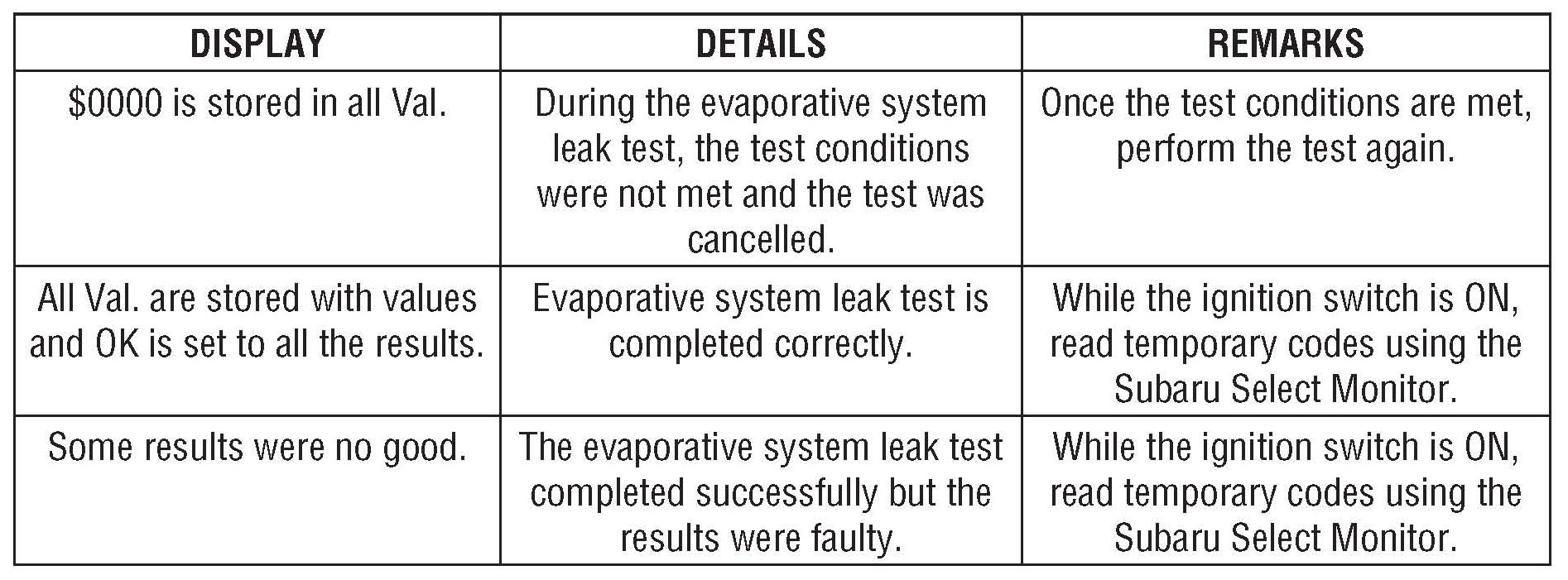 ^ The Subaru Select Monitor screen does not change after the evaporative system leak test is complete or when the test is aborted by turning off the ignition switch.