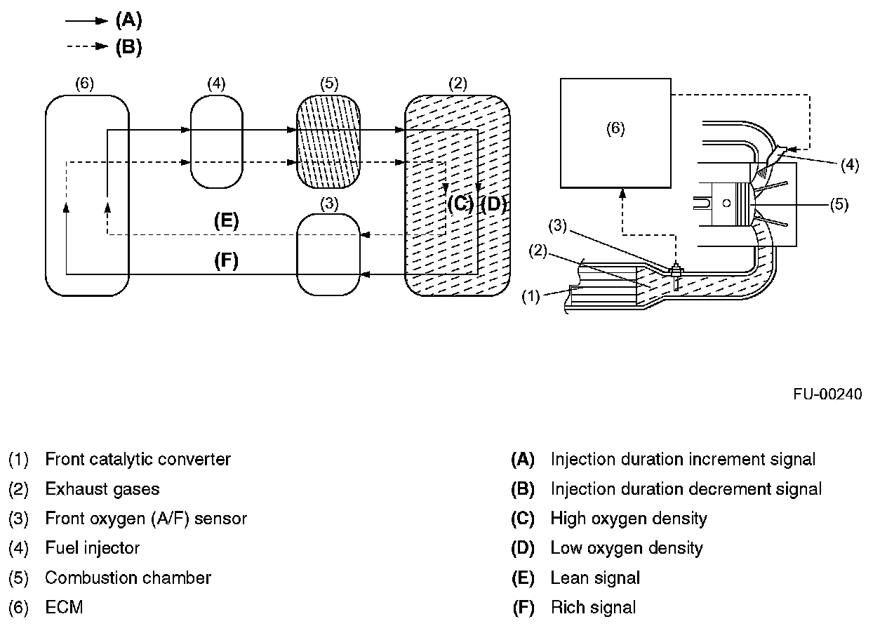 - In the air-fuel ratio feedback control, the ECM calculates the necessary amount of correction based on data from the front oxygen (A/F) sensor and adds the result to the basic duration (which is stored in the ECM's memory for each condition defined by the engine speed and various loads.)