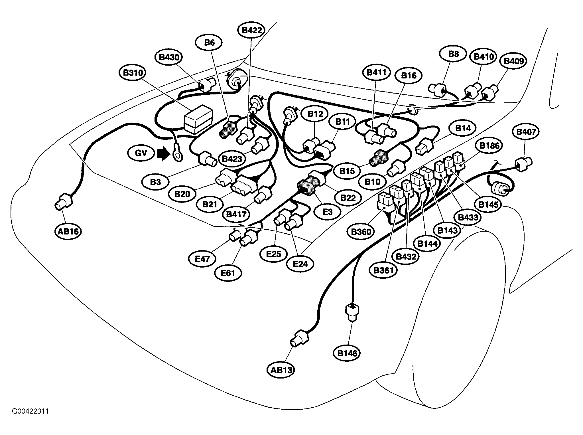 | SBF Holder (B432) | Left side of engine compartment. See Figure. |