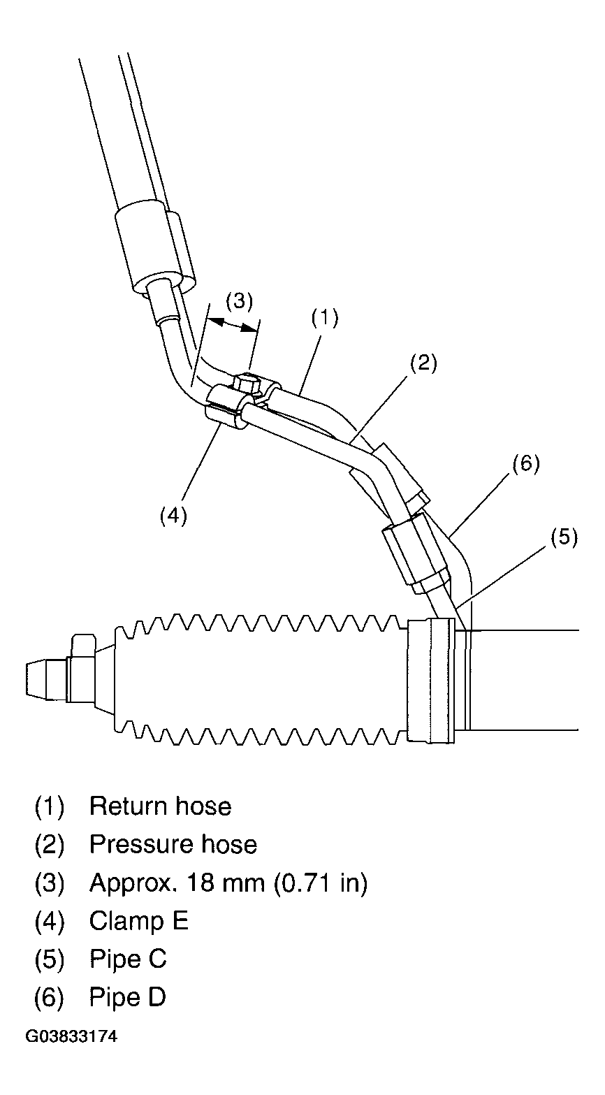- Temporarily connect the pressure hose and pipe C, the return hose and D. Place the clamp E in the position shown in Fig 6 , and tighten the bolt temporarily.