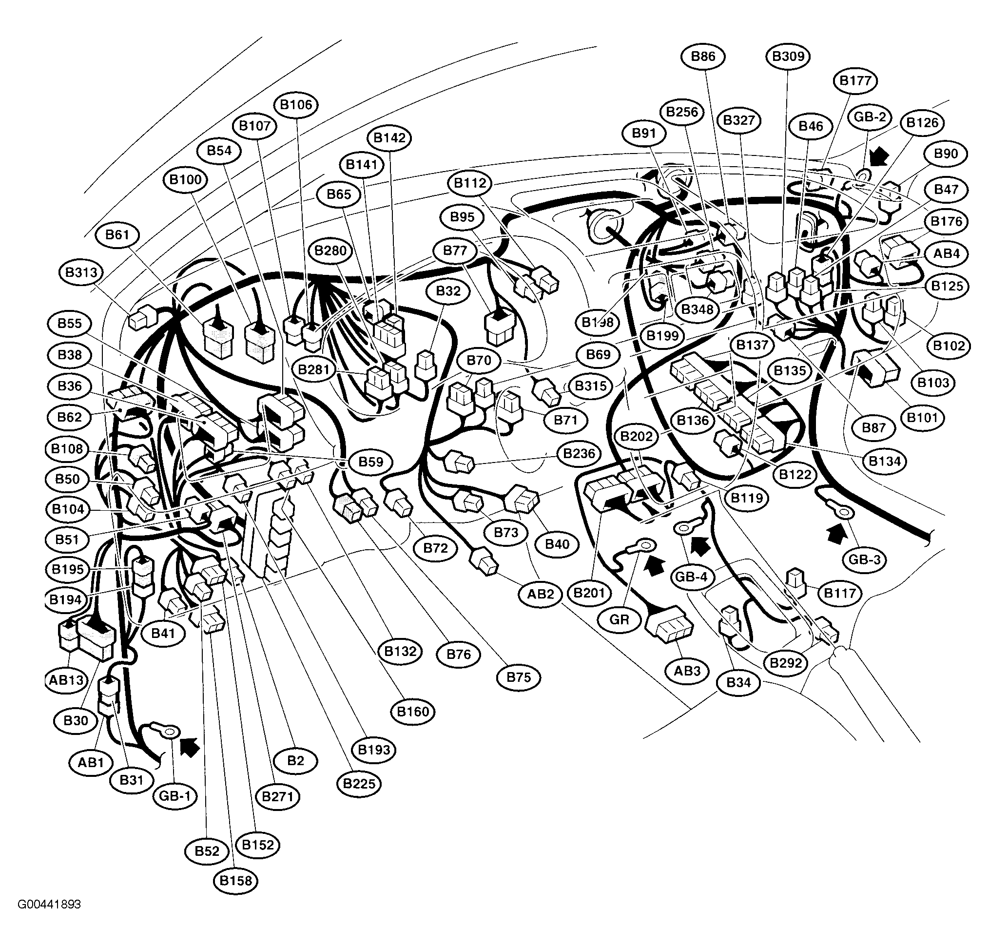 | Relay Block (B225) | Behind right side of dash. See Figure. |
