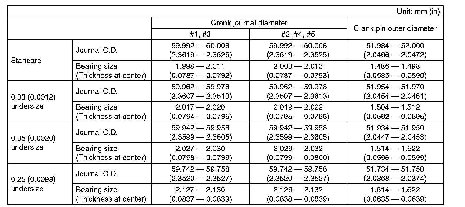Crankshaft oil clearance, standard 0.010 - 0.030 mm (0.0004 - 0.0012 inch)