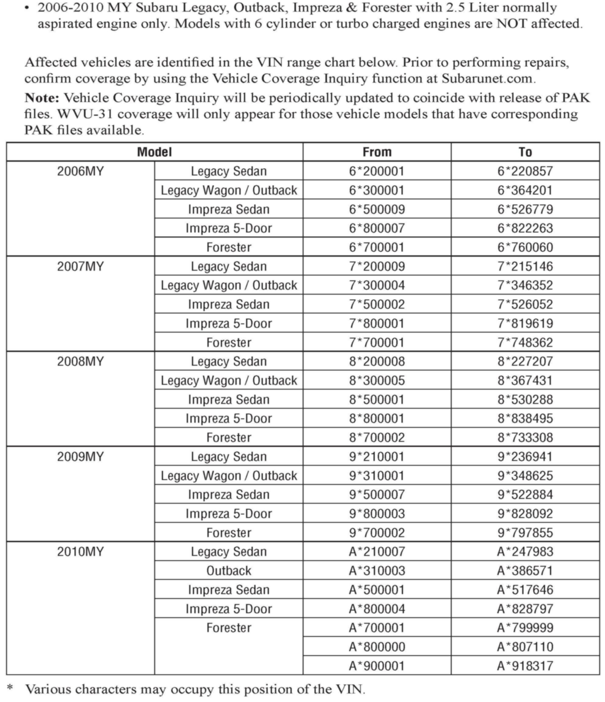 ^ Vehicle Coverage Inquiry, available at Subarunet, will be periodically updated to coincide with release of PAK files. WVU-31 coverage will only appear for those vehicle models that have corresponding PAK files available.