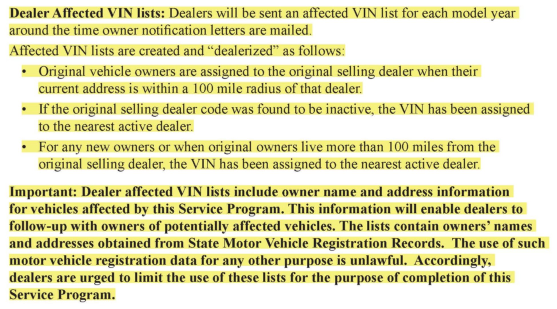 For dealers with more than 600 customers affected by this program for any given model year, initially the first 600 letters will be mailed according to the schedule. Any additional letters will be mailed during the following week.