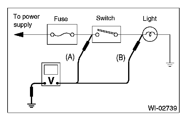 2. Contact the positive lead of the voltmeter on connector (A). The voltmeter will indicate a voltage.