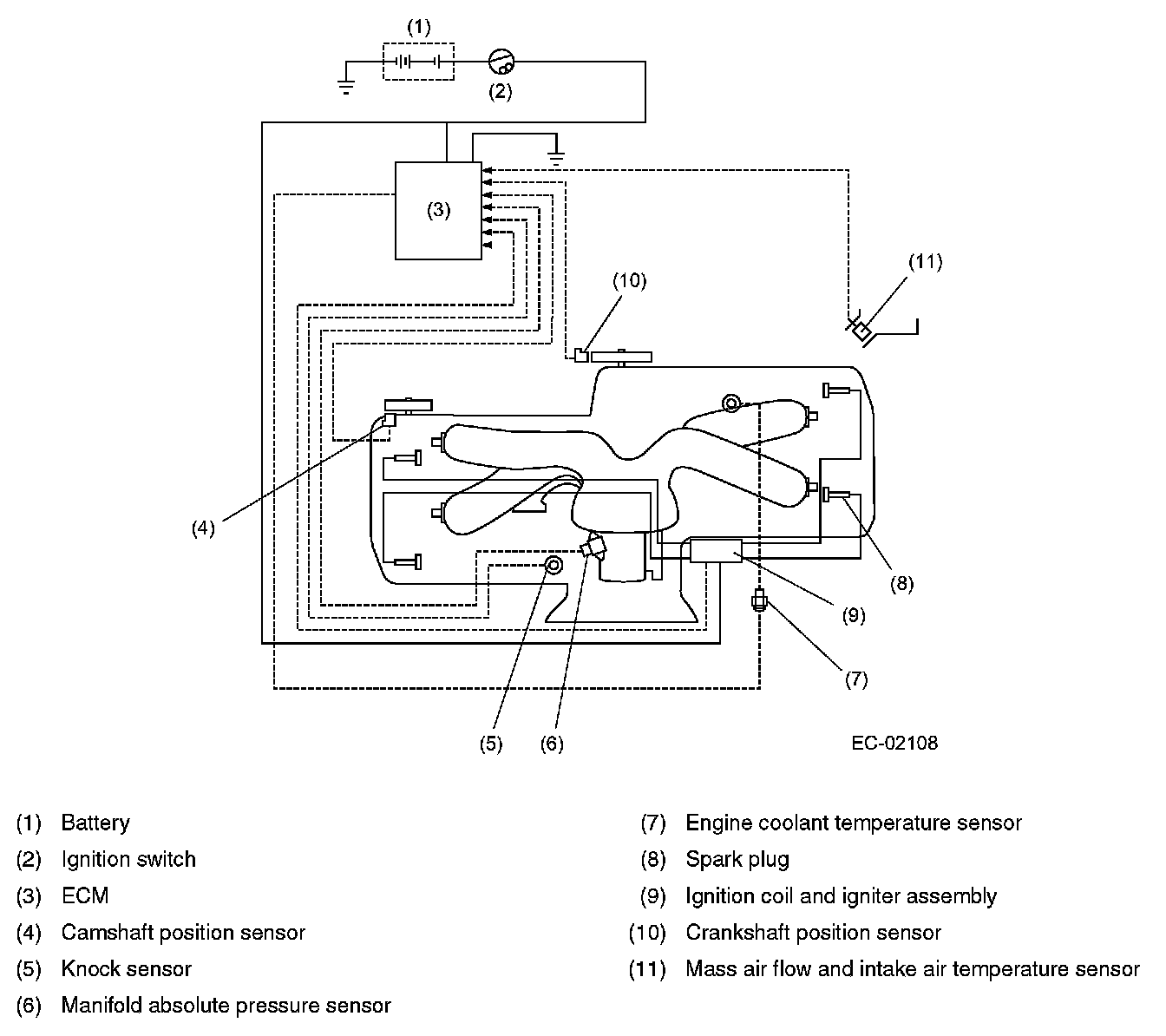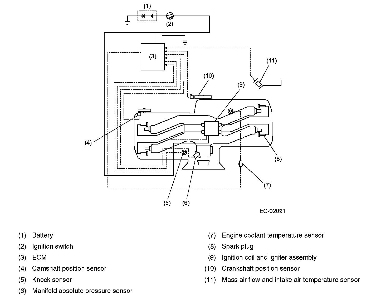 Ignition Control System- The ignition system is controlled by the ECM. The ECM monitors the operating condition of the engine using the signals from the sensors and switches shown below and determines the ignition timing most appropriate for each engine operating condition. Then it sends a signal to the igniter, commanding generation of a spark at that timing.