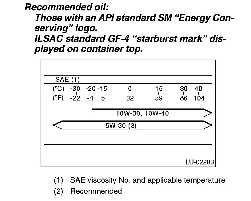 NOTE: If the vehicle is used in regions with high temperatures or in other severe environments, use oil with the viscosities shown below. API standard: SM or SL SAE viscosity No.: 30, 40, 10W-50, 20W-40, 20W-50